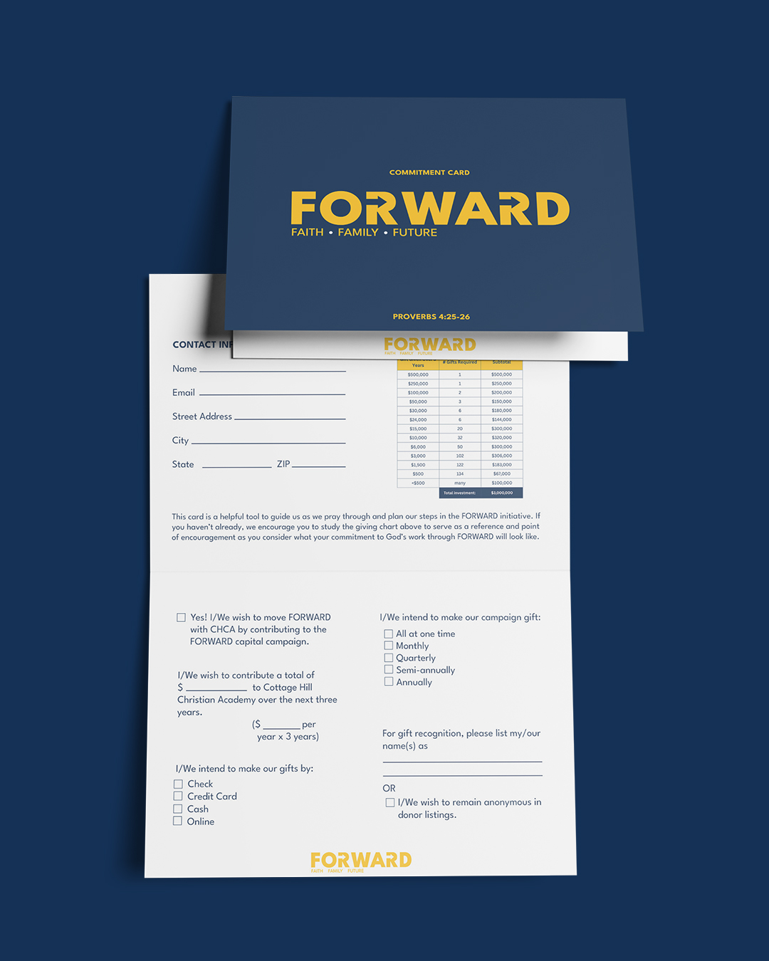 Our chca families will be receiving a commitment card in the mail. This card will be a helpful tool to guide us as we pray through and plan our giving for the next three years. It also provides a way to communicate your giving plan to the leadership of the school. We will come together on September 25 to pledge our commitments to this initiative together!